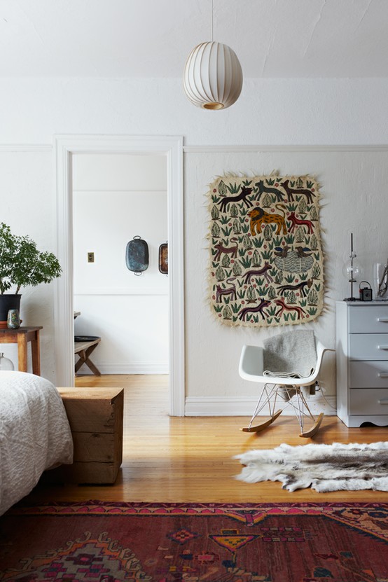 Look at all the textiles at work above and below... a Kilim rug, embroidered woolen wall tapestry, pelt on the floor, throw blanket on the mid-century chair, and fluffy duvet, act as an invitation to sit down, snuggle up, and ahhhhh... relax. Note, the whimsical animals in the tapestry.